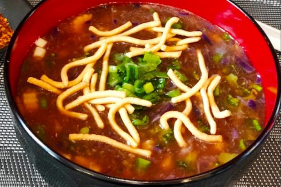 Hot and Spicy hot liquid appetizer made with Chopped Chicken, Chopped Vegetables like Chilli, Garlic, Carrot, Cabbage, Beans, Mushroom, Brocolli, soy sauce & topped with crispy fried noodles.